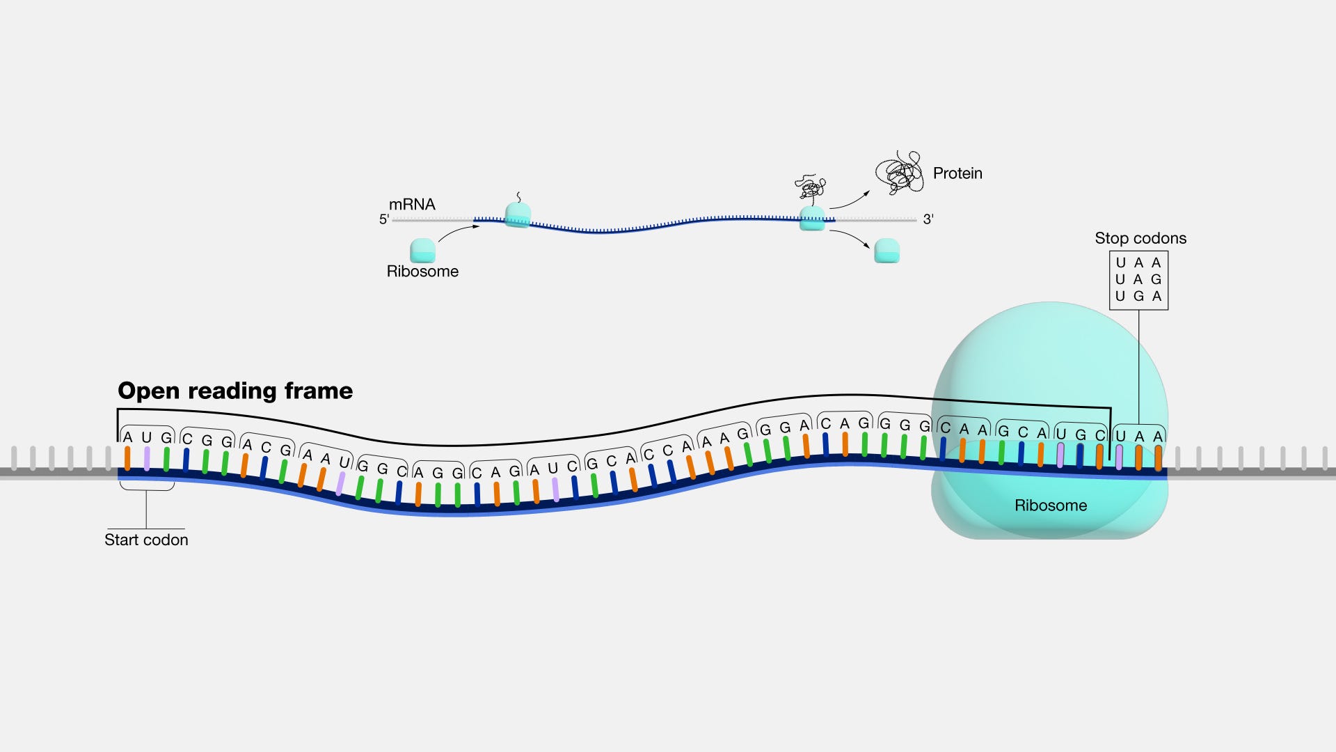 Open reading frames (ORFs). Remember that DNA codes for → RNA which codes for → protein. This happens when a ribosome slides along that string of RNA letters and turns them into amino acids. At some point, the ribosome hits a stopping point (it’s literally called a stop codon), and stops along the string of letters. That whole string of letters before the stopping point? That’s the open reading frame (ORF).
