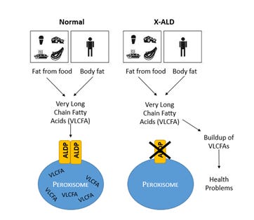 X-linked adrenoleukodystrophy (ALD) is a disease in which the most severe form causes a sudden onset of learning and behavioral problems, and often total disability and death within only a few years. This is caused by the buildup of very long-chain fatty acids (VLCFAs) in the body as they fail to enter an organelle called the peroxisome. This buildup of VLCFAs results in damage to cells in the brain.